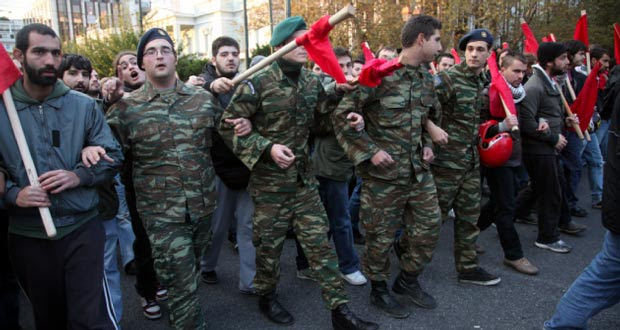 Iako mala i siromašna, Grčka je jedna od najmilitariziranijih zemalja u Europi. Do krize bila je veliki kupac oružja, a još je uvijek obavezan i vojni rok. Do sredine 1970-ih zemljom je vladala fašistička vojna hunta, a njezine posljedice i danas se osjećaju. Iako su obavezni služiti vojni rok, Grci ne dopuštaju političarima i generalima da se s njima igraju. Za svoja prava su se kao ročnici spremni boriti. Jedna od organizacija koje vode tu borbu je Mreža slobodnih vojnika Spartak.