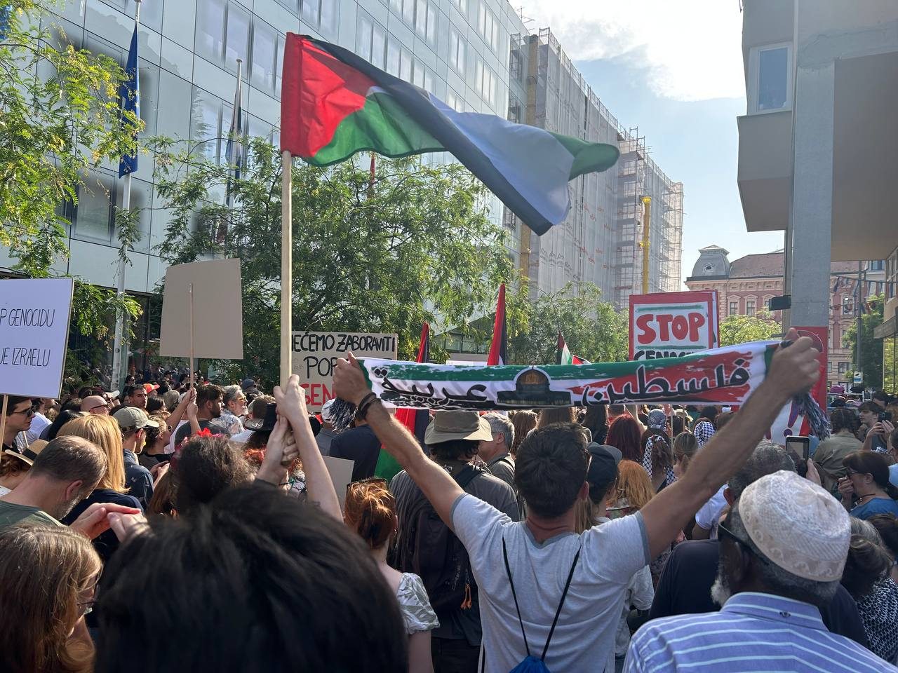 U nedjelju, 15. juna pridružili smo se Maršu za Palestinu. Okupljanje koje je organiziralo nekoliko propalestinskih lokalnih inicijativa (Inicijativa za akademiju solidarnosti i epistemičke pravde, Inicijativa za slobodnu Palestinu, Centar za mirovne studije, Štrajk za Gazu, Studentice za Palestinu, Za KRUH) je simbolički započelo na Europskom trgu odakle je povorka od više od tisuću ljudi krenula ka Ministarstvu vanjskih poslova RH. Izbor lokacija i opći ton protesta usmjerili su se na europsku i lokalnu politiku militarizacije, suučesništva u genocidu, etničkom čišćenju, kulturo- i ekocidu.